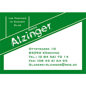 Herzlich Willkommen bei der Glaserei Alzinger! Wir sind Ihr Ansprechpartner in Kösching. Der Traditionsfachbetrieb im Herzen Köschings. Seit 1821 realisieren wir Wünsche rund ums Glas - von Duschen bis Küchenrückwände, von Glastüren bis hin zu kompletten Ganzglasanlagen. Mit Glas sind keine Grenzen gesetzt. Lassen Sie sich von einem einzigartigen Werkstoff verzaubern. Bei Fragen können Sie uns gerne kontaktieren. Wir freuen uns von Ihnen zu hören. Ihr Team von Glaserei Alzinger.